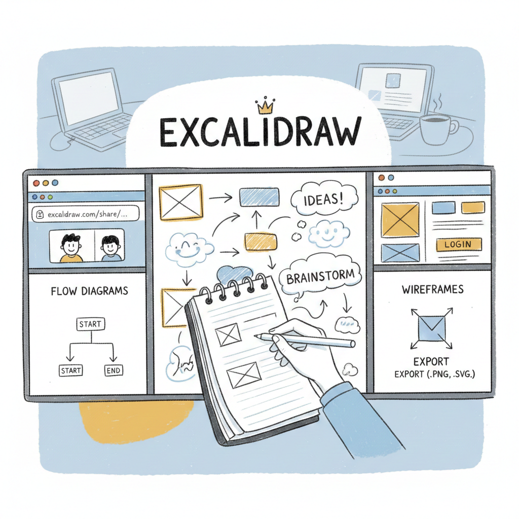 Excalidraw is a hand-drawn style whiteboard tool designed for brainstorming and explaining ideas visually. It is lightweight, fast, and easy to share with others through a link.